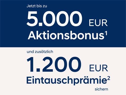 Sichere dir jetzt den Aktionsbonus von bis zu 5.000 EUR1 und zusätzlich auch noch 1.200 EUR Eintauschprämie2 für unsere Top-Modelle.